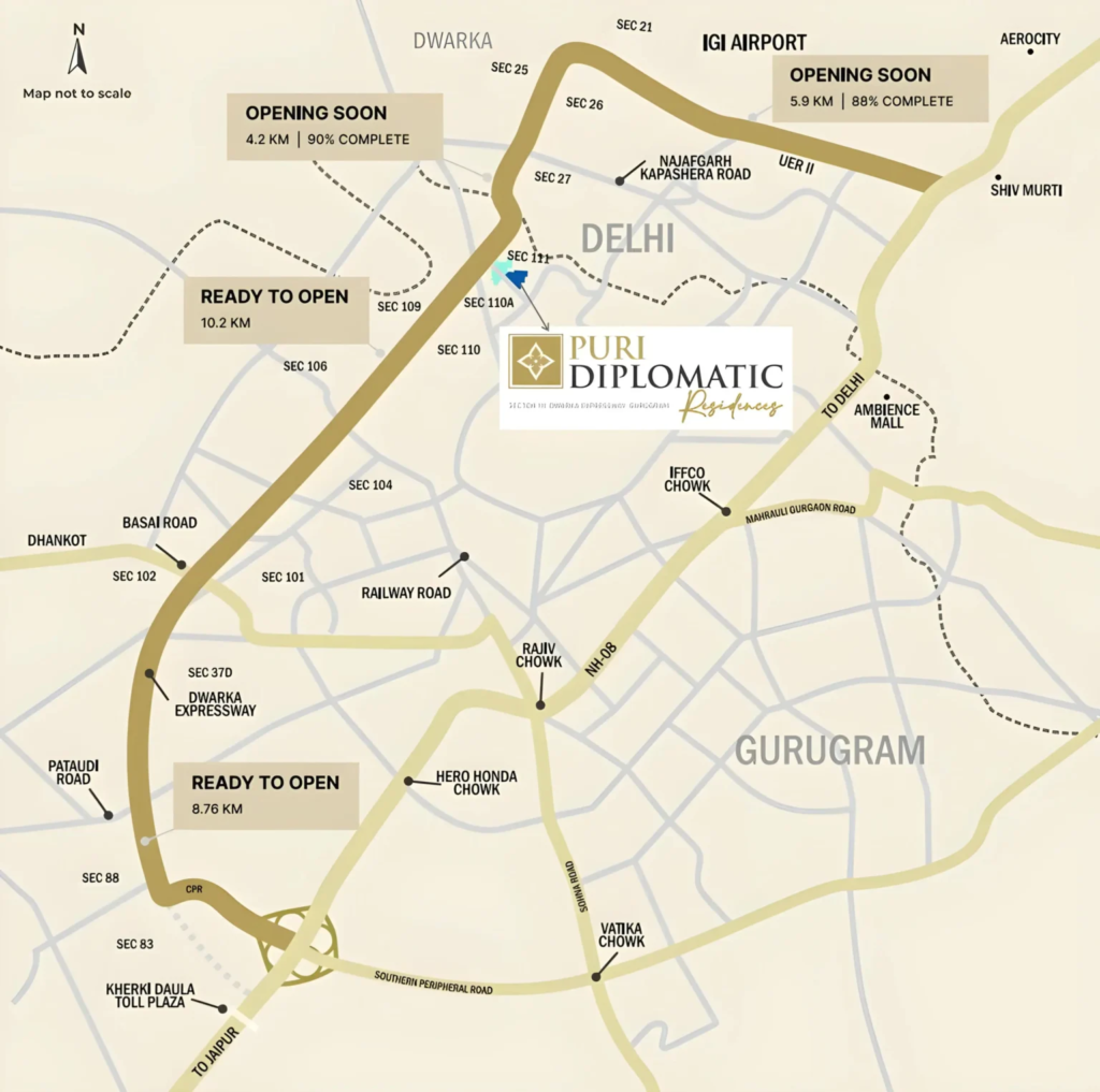 Strategically positioned along the Dwarka Expressway, Puri Diplomatic Residences provide seamless connectivity to major points of interest, including the Dwarka Sector 21 Metro Station, Indira Gandhi International Airport, and Gurgaon Railway Station. Moreover, with easy access to NH48, Western Peripheral, and IGI Airport, residents enjoy unparalleled convenience in commuting.